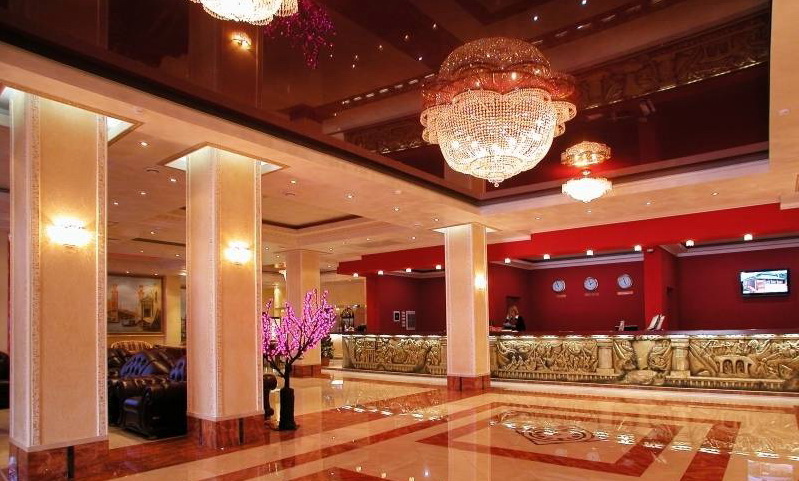 | ХОЛЛ Расположение наблюдать со стороны входа - стойка регистрации (справа от входа) - огромный красный ковёр посередине комнаты - пустые бардовые стены - позолоченная люстра - 5 диванчиков у стен - колонка с приглушённой музыкой при ожидании - 3 фикуса в горшке с землёй (сдвинуть может только очень сильный человек явно не стандартного телосложения) - брошюра с рекламой отеля - огнетушитель в свободном доступе - камера наблюдения - две полукруглые лестницы, ведущие на второй этаж. Однако, дверь на второй этаж закрыта.
